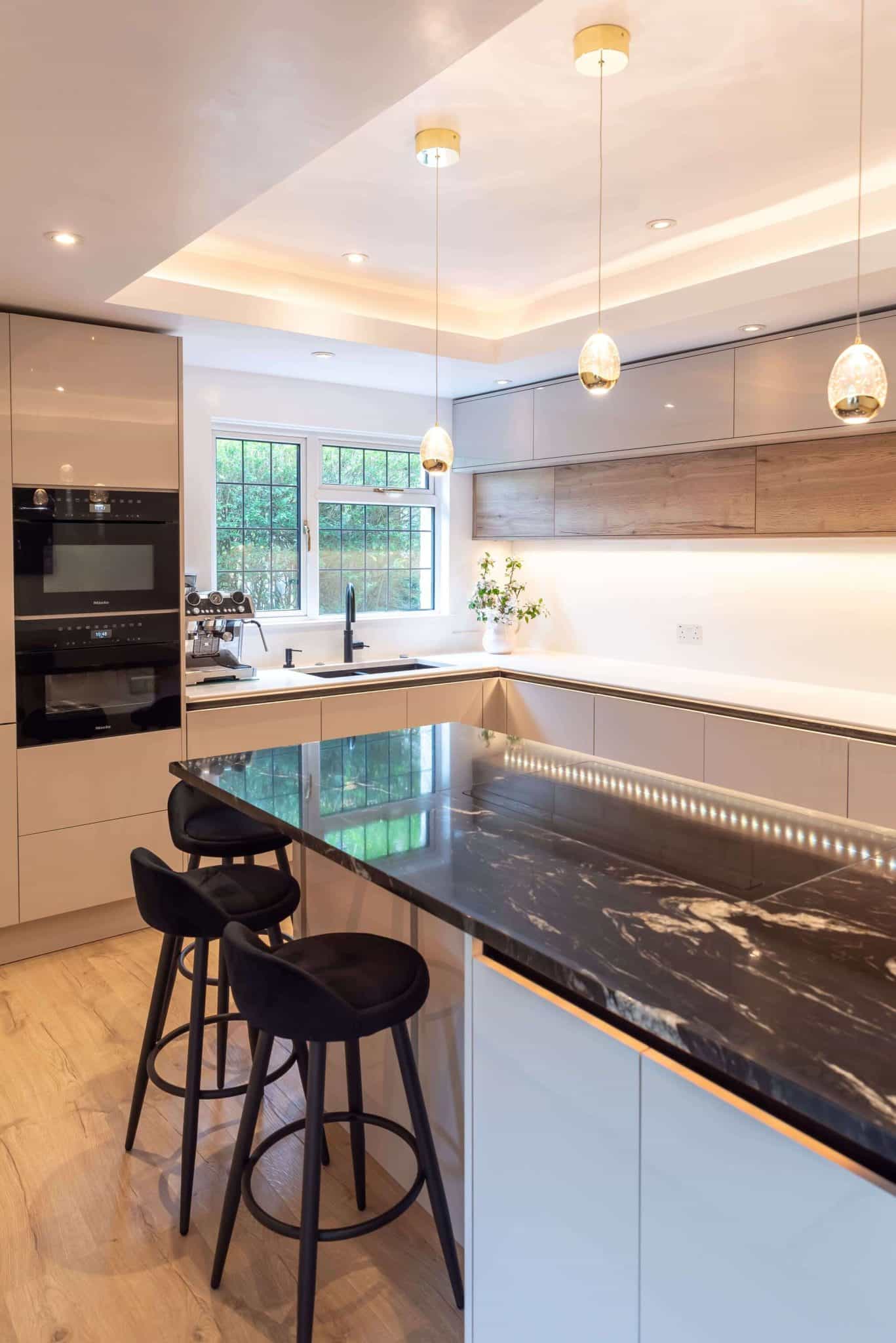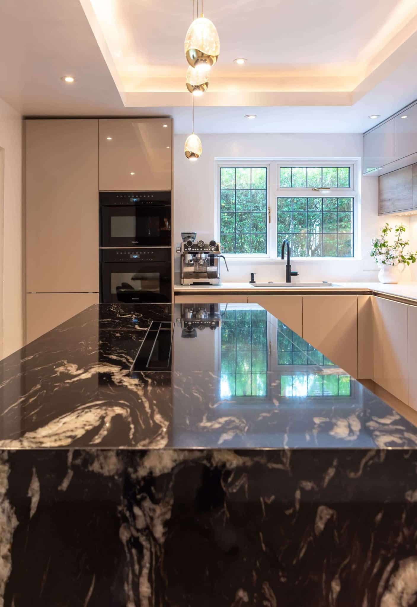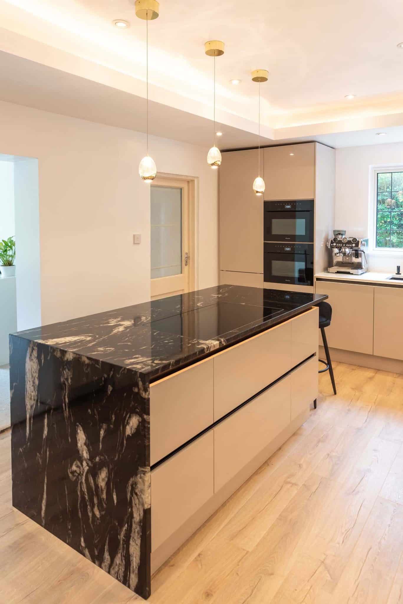 Together, we explored a range of finishes, layouts, and features, carefully narrowing down choices to bring their vision to life. Their selected colour palette centred around soft, neutral tones – subtle shades that evoke calm and warmth, while ensuring the design would remain timeless. To introduce contrast and make a bold statement, they chose a striking granite worktop for the island. The natural veining added texture and drama, becoming the room’s stunning focal point.