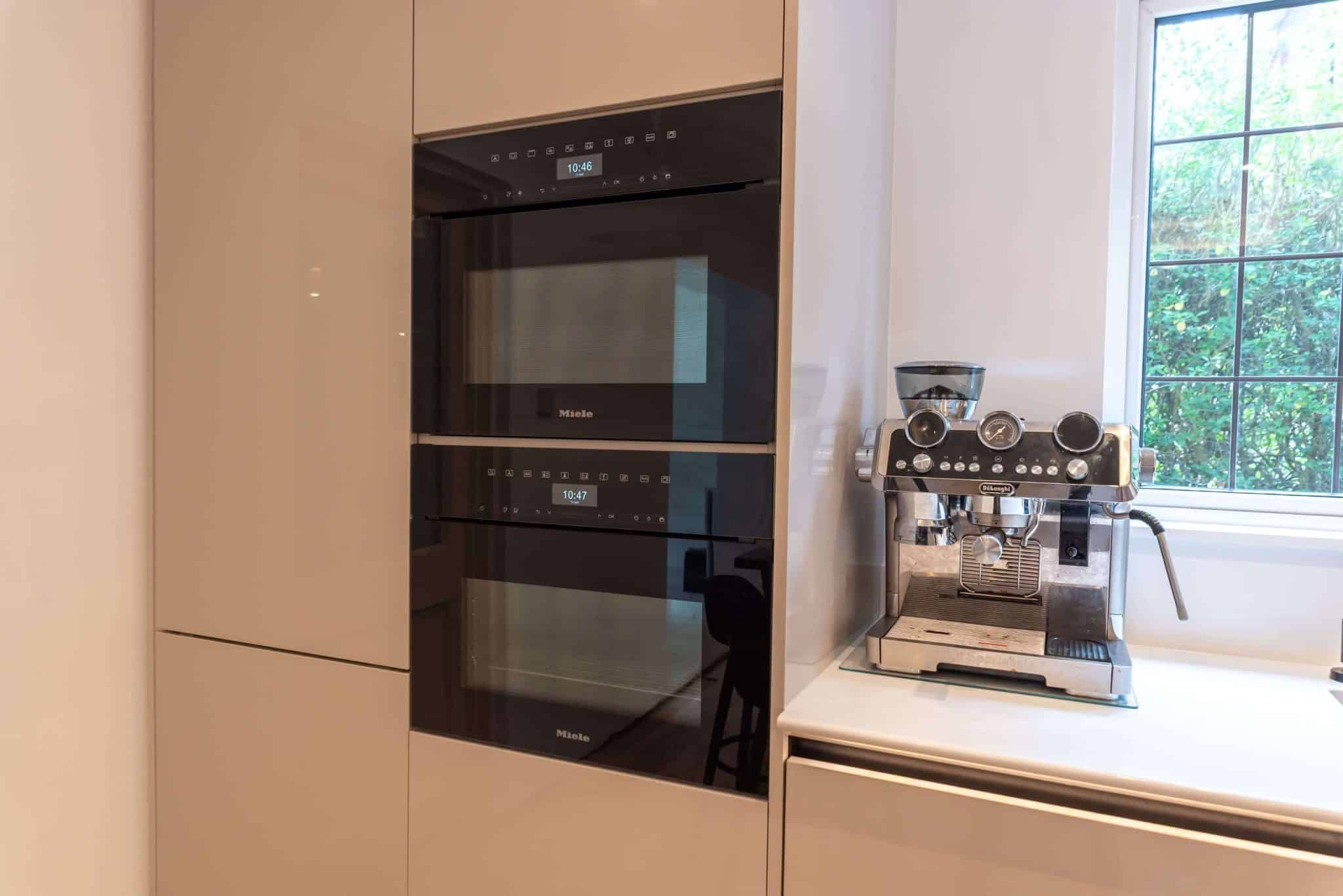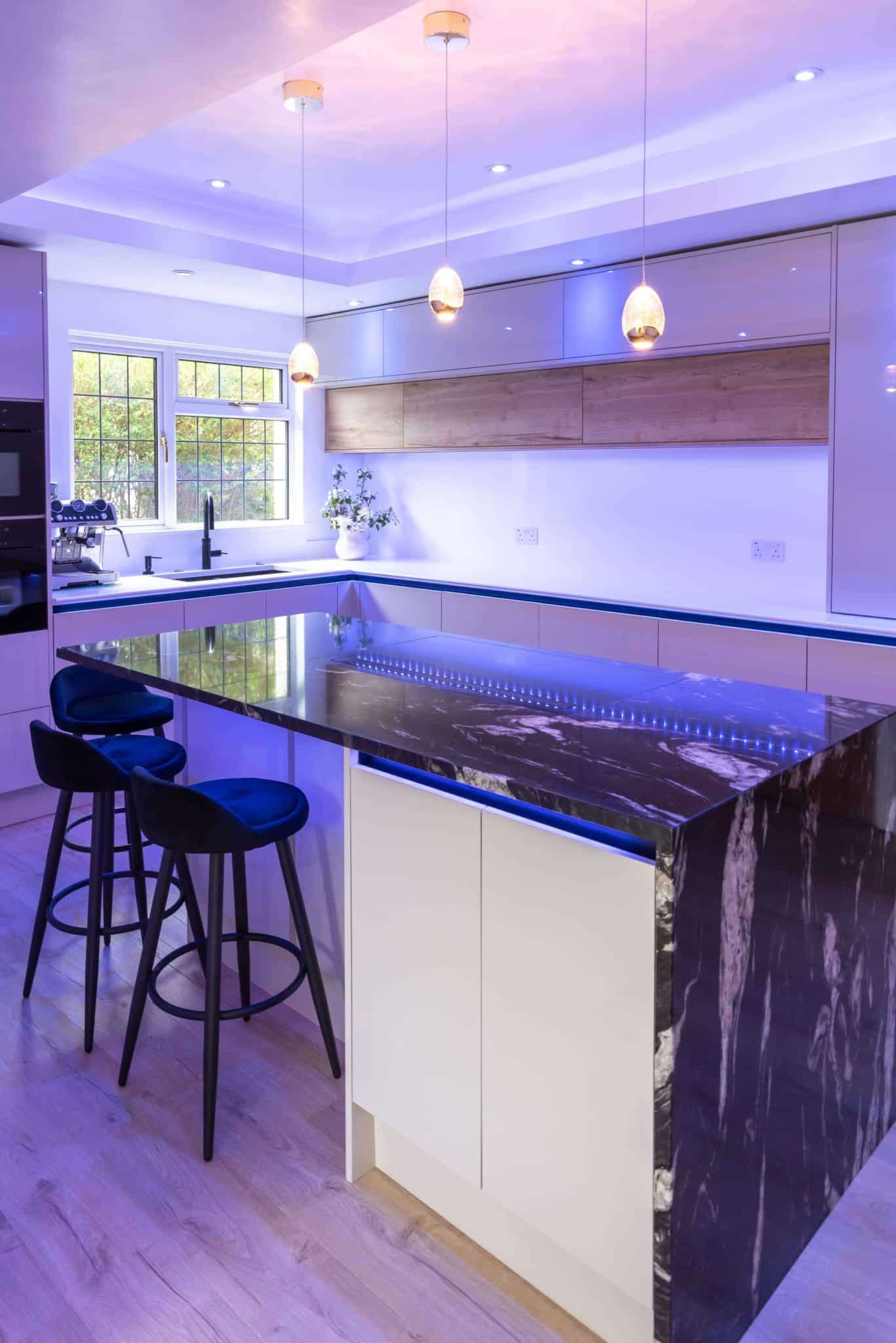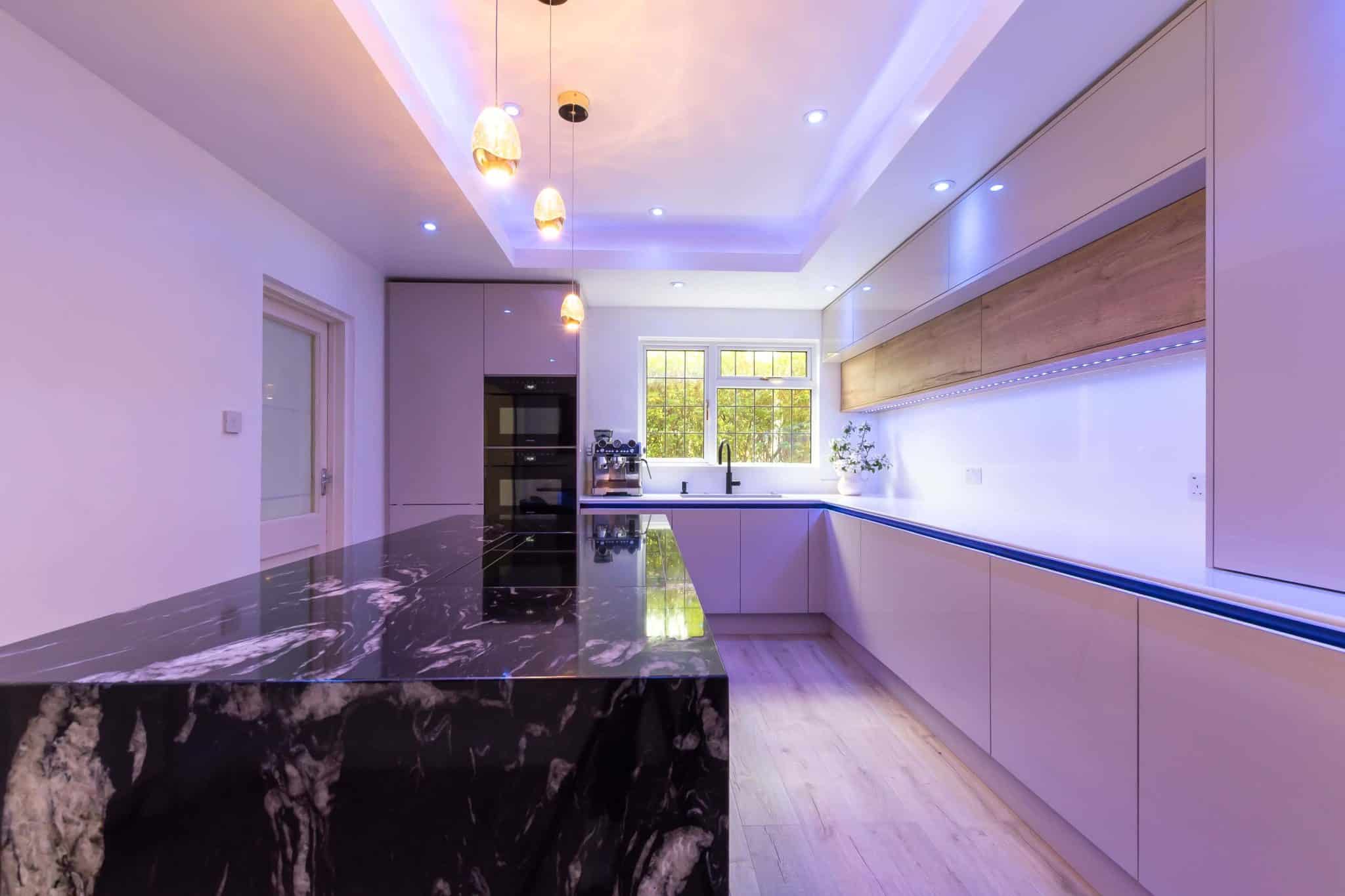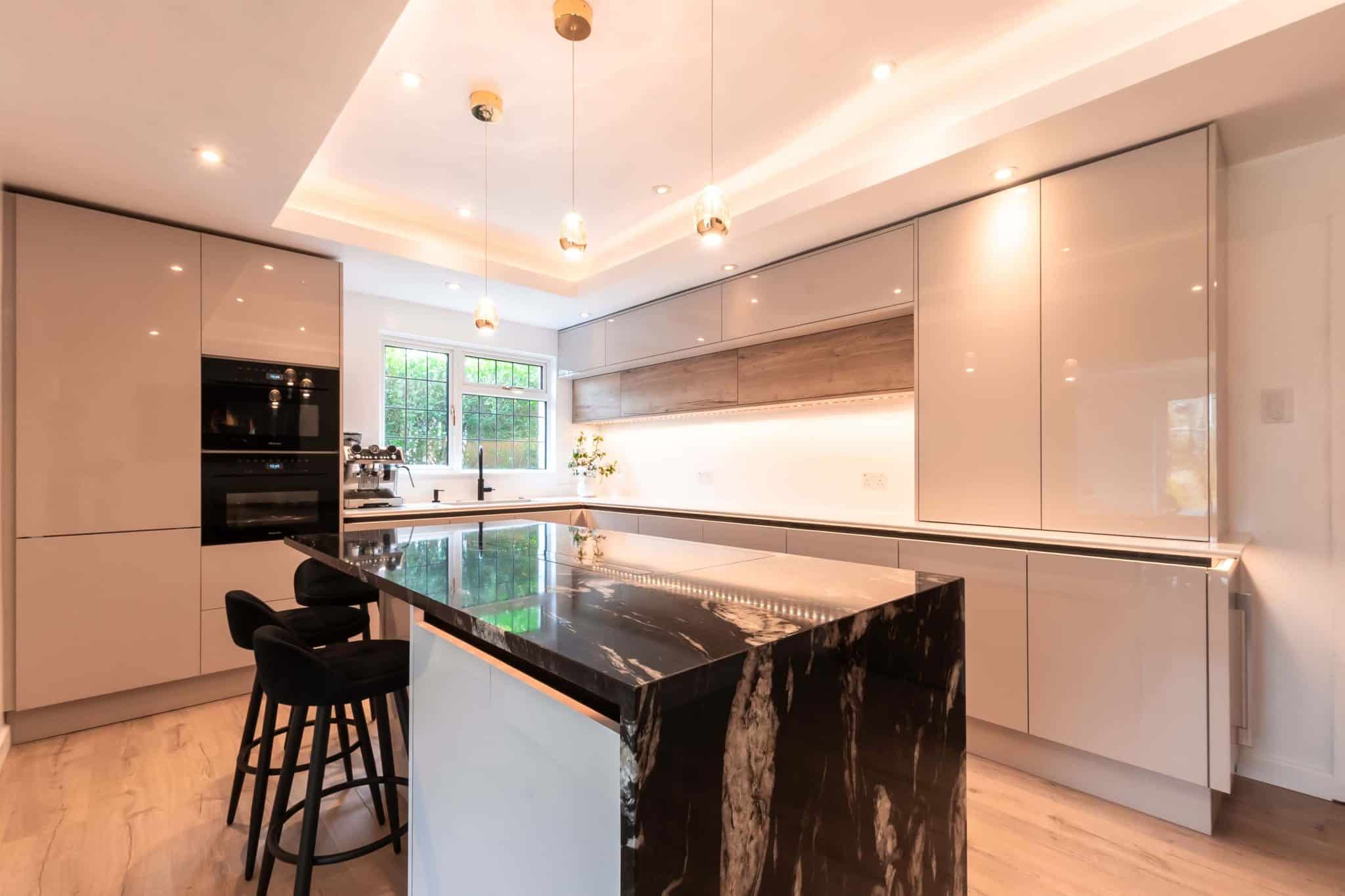 Together, we explored a range of finishes, layouts, and features, carefully narrowing down choices to bring their vision to life. Their selected colour palette centred around soft, neutral tones – subtle shades that evoke calm and warmth, while ensuring the design would remain timeless. To introduce contrast and make a bold statement, they chose a striking granite worktop for the island. The natural veining added texture and drama, becoming the room’s stunning focal point.
