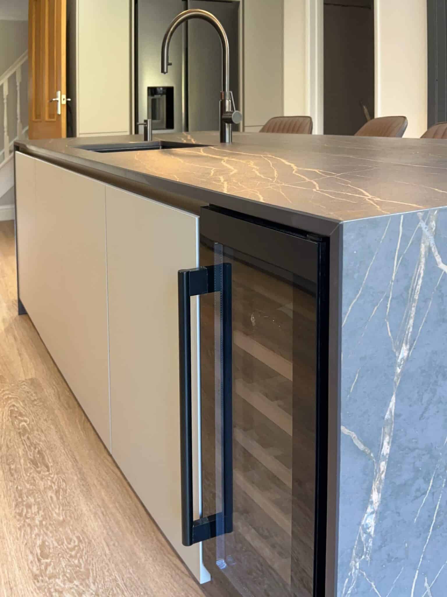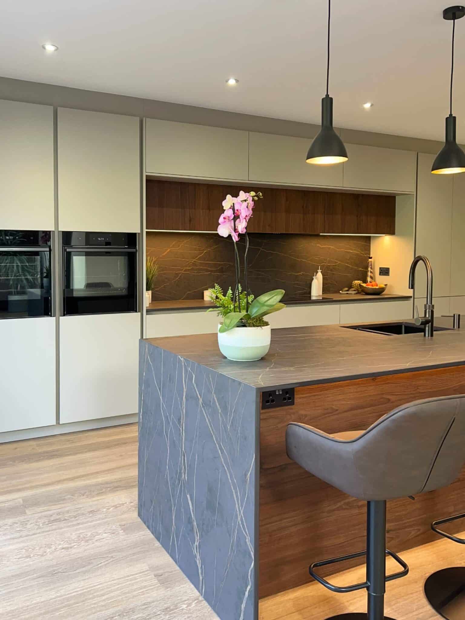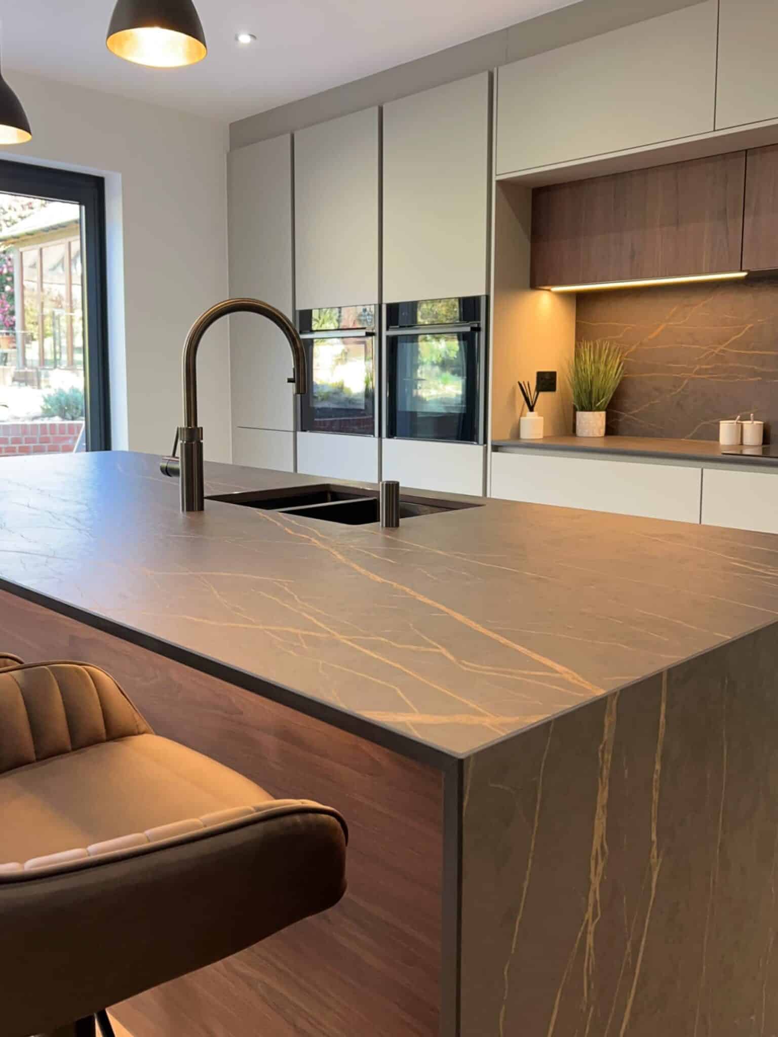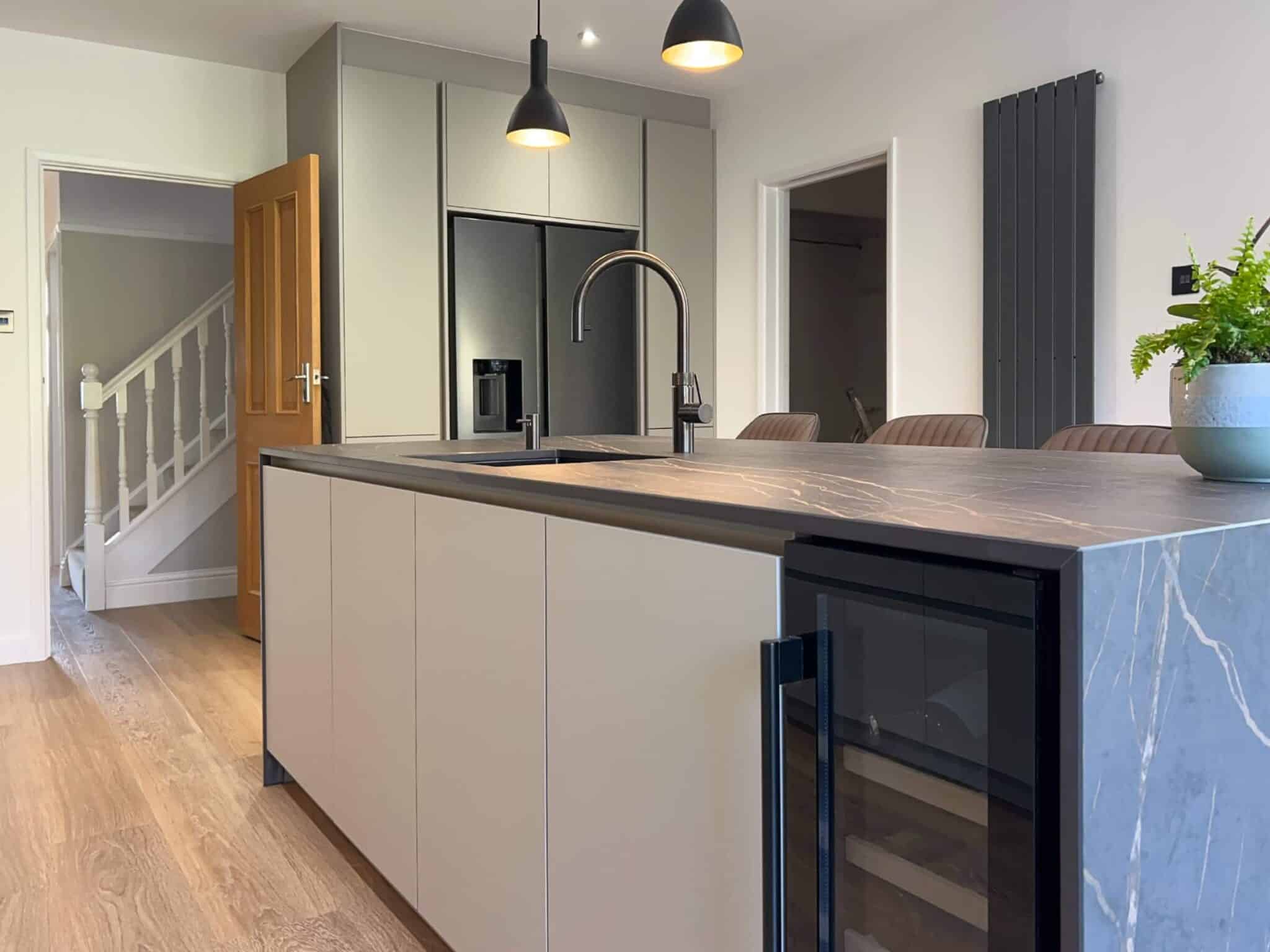 Dekton Laurent worktops run throughout, including a mitred island end panel and full cladding, adding a sense of continuity and a subtle, considered finish.