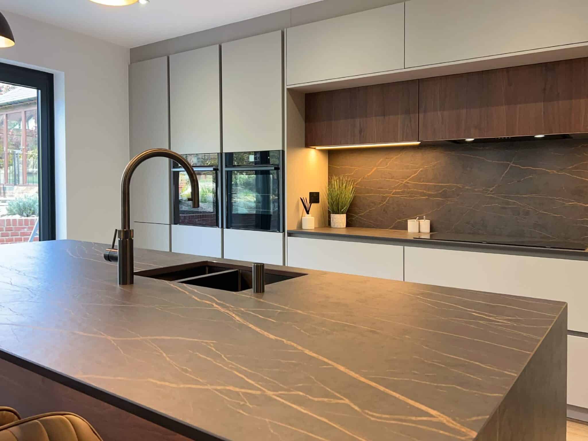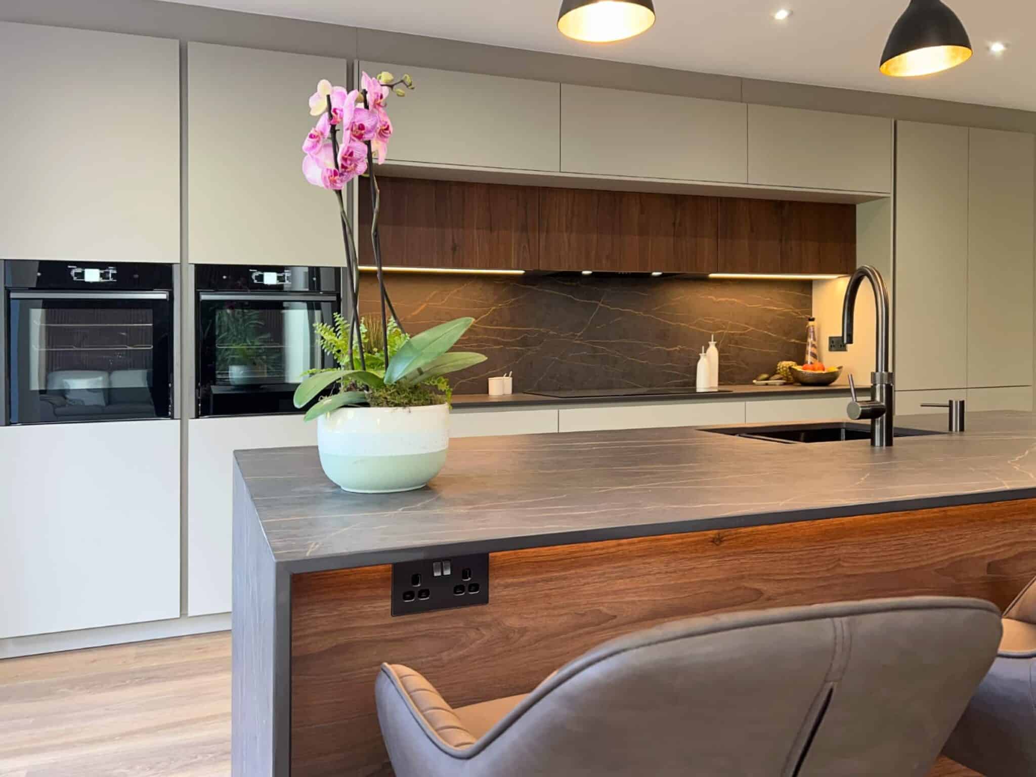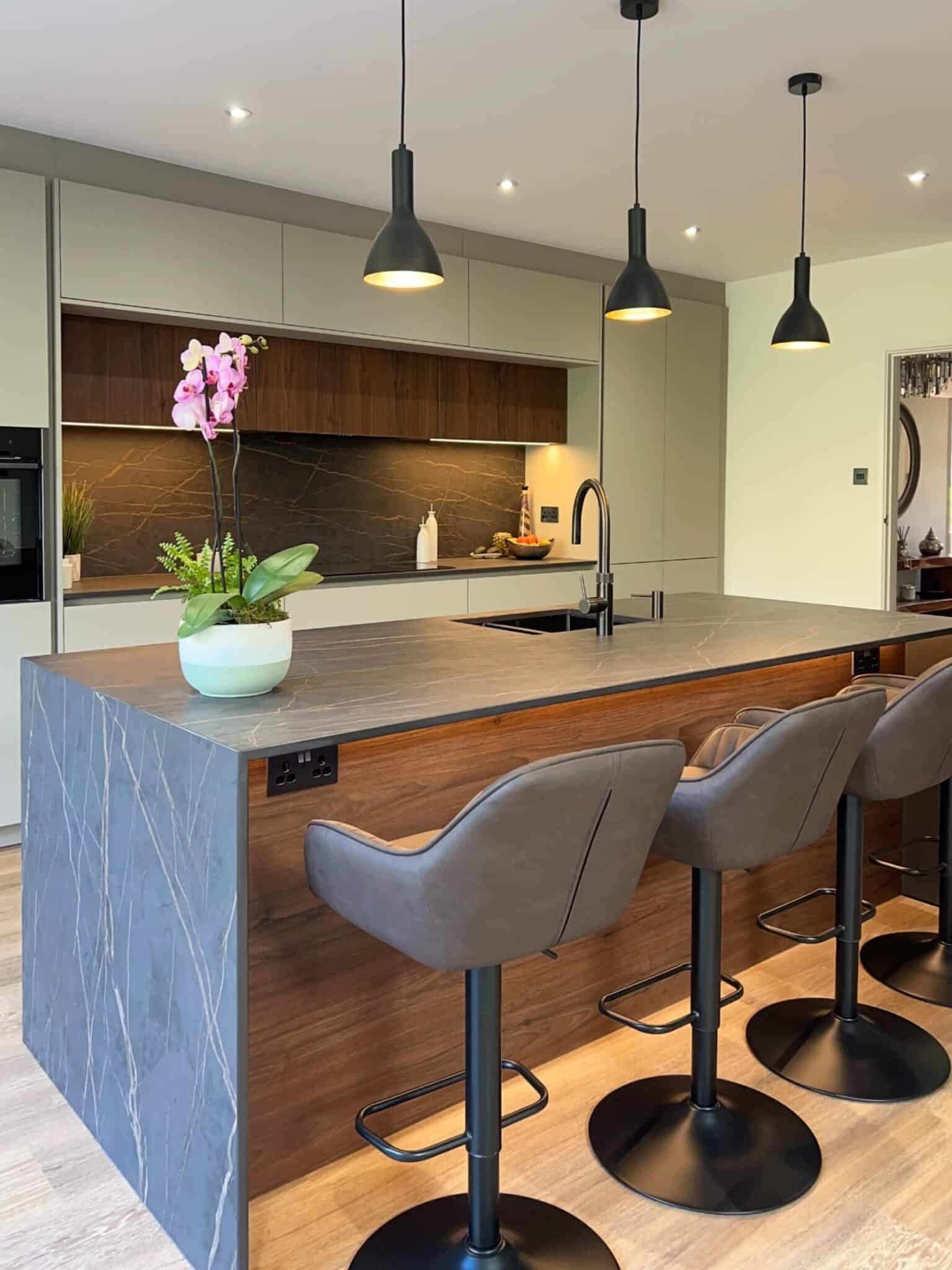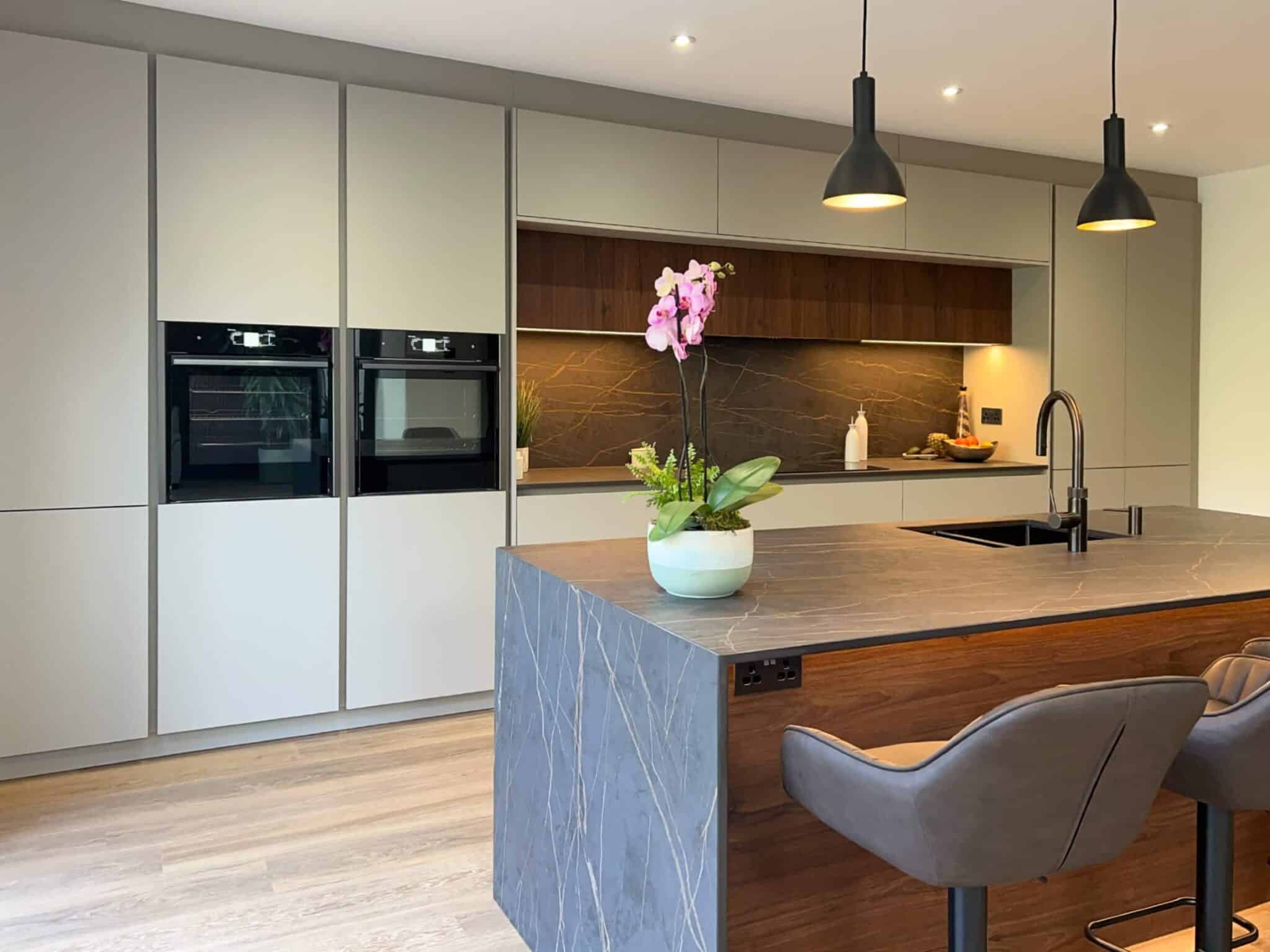 Dekton Laurent worktops run throughout, including a mitred island end panel and full cladding, adding a sense of continuity and a subtle, considered finish.
