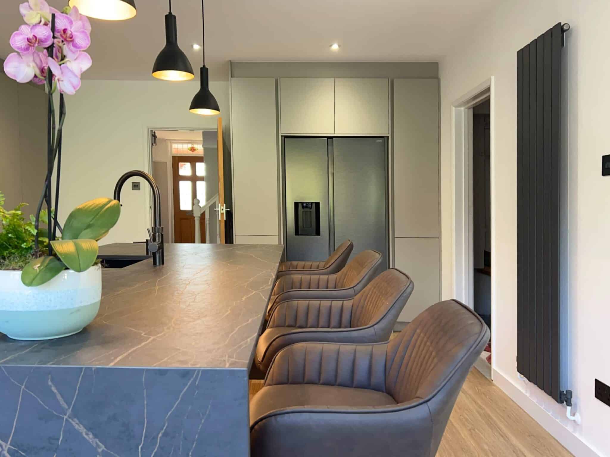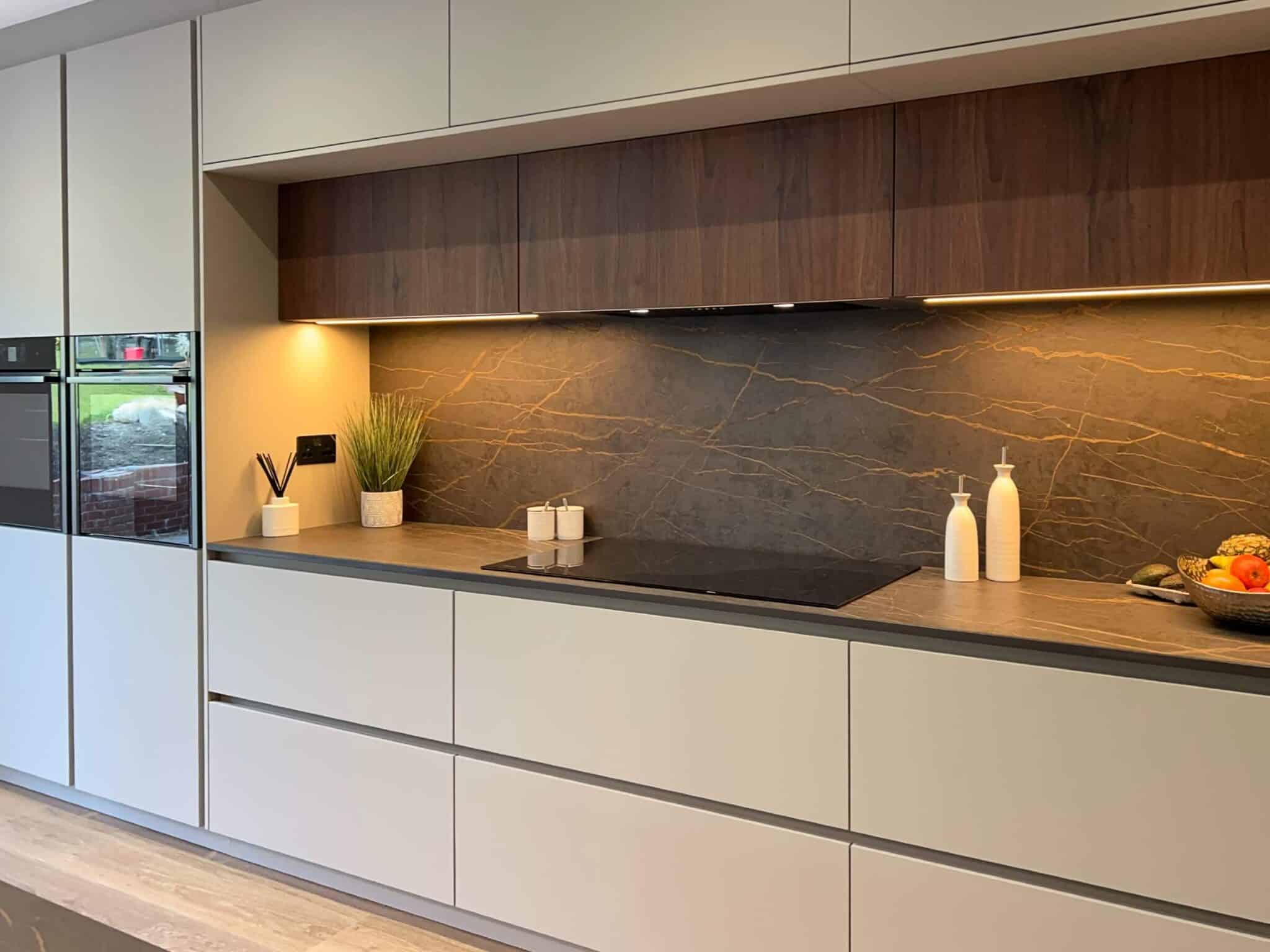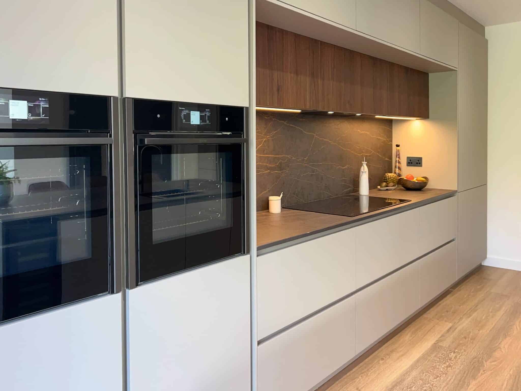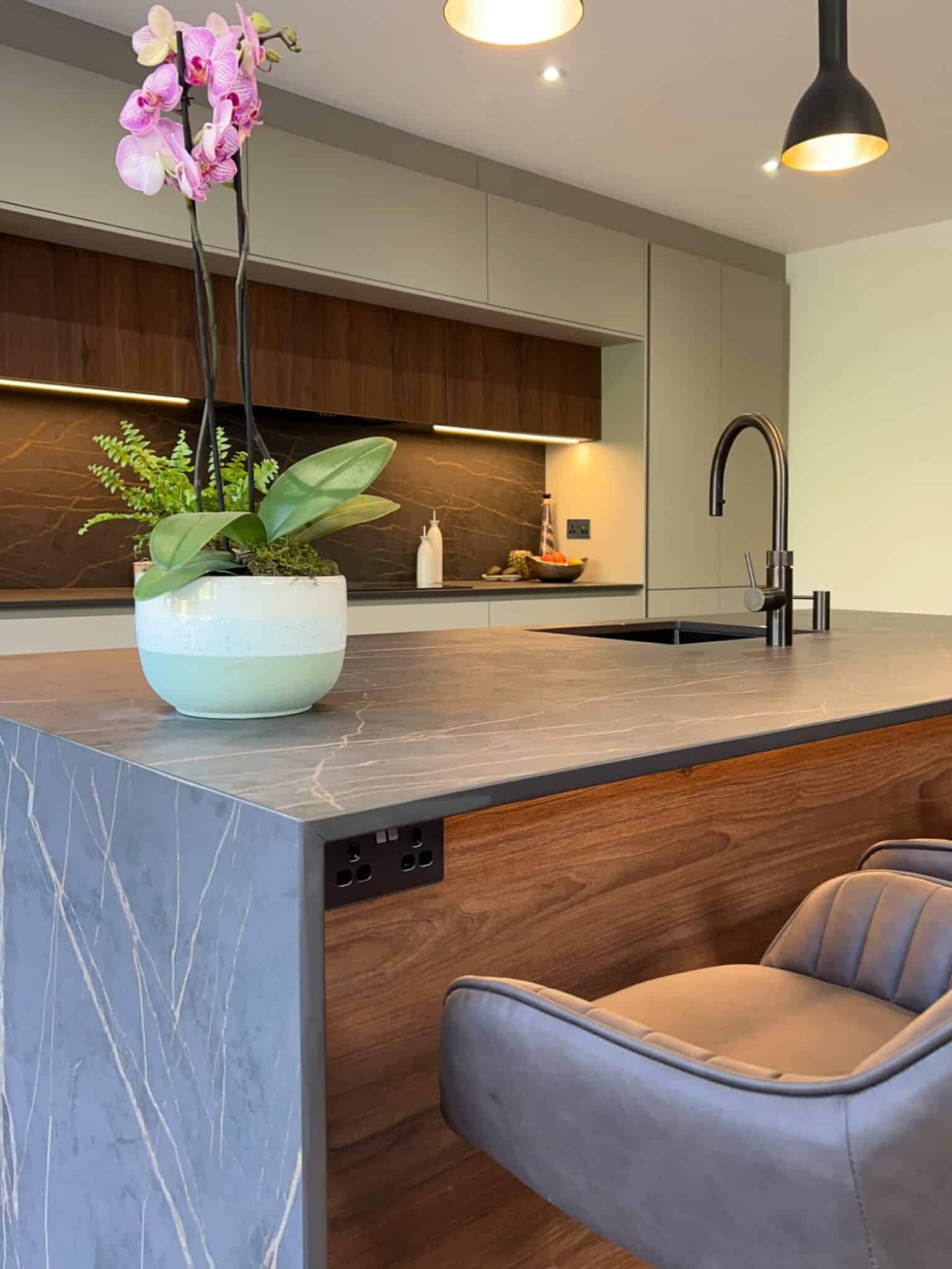 Dekton Laurent worktops run throughout, including a mitred island end panel and full cladding, adding a sense of continuity and a subtle, considered finish.