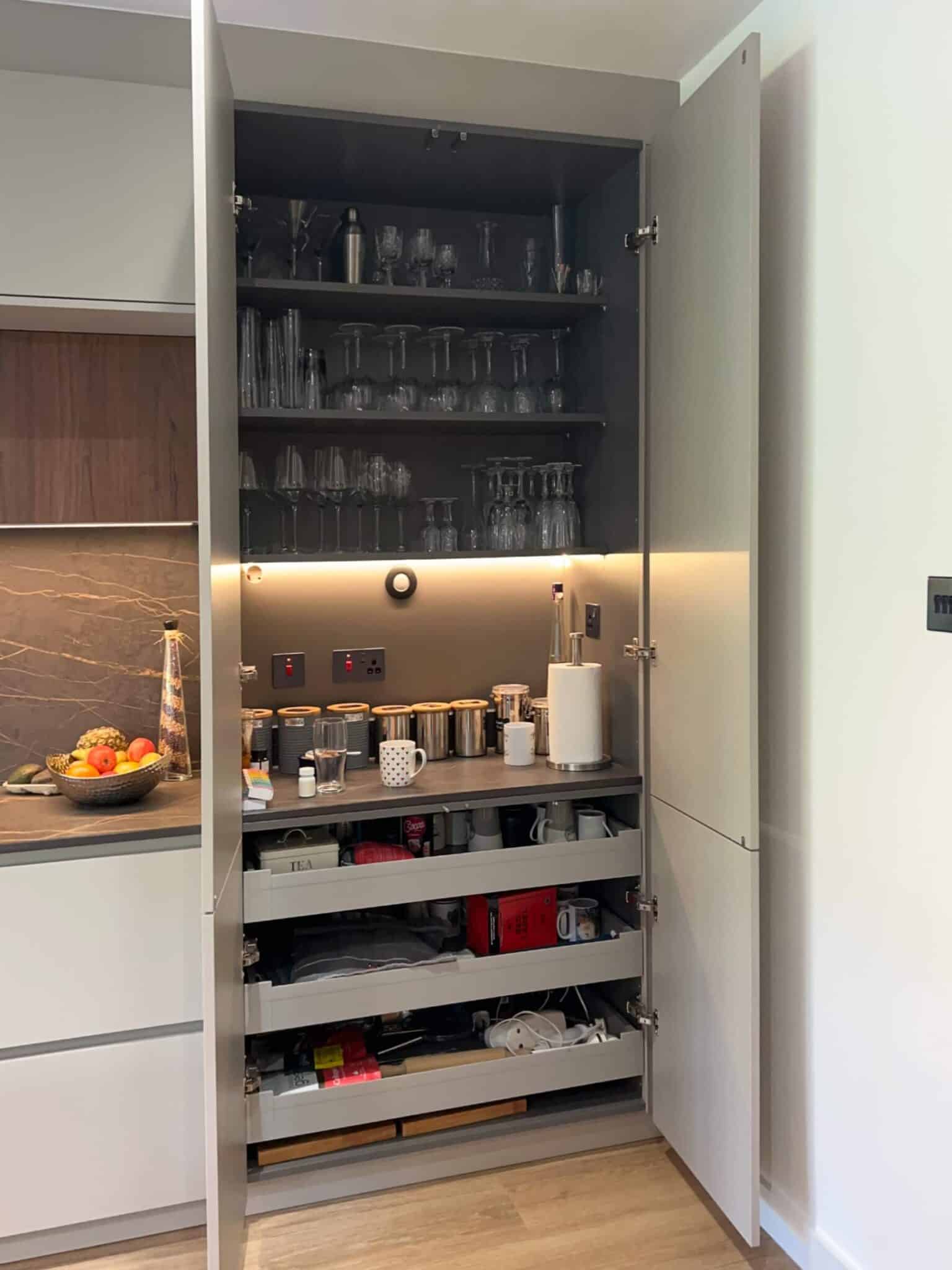 Thoughtful details elevate the overall design, including a breakfast pantry with internal lighting, a bespoke top box above the fridge freezer, and the introduction of the new Top Soft door finish, complete with an anti-fingerprint coating for everyday ease.